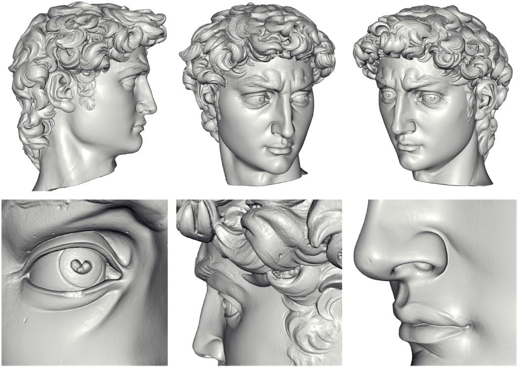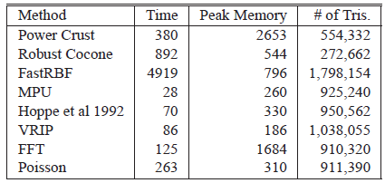 논문에 언급된 가장 퀄리티가 좋은 결과입니다. 약 2억개의 points를 입력을 받아, 5.2GB RAM으로 (2006년 CPU기준) 1.9시간이면, 약1600만개정도 Triangle로 구성된 Mesh를 만들어 냅니다.