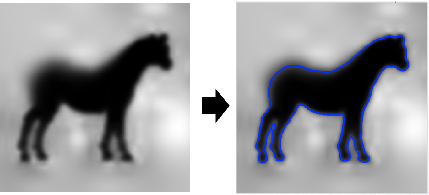 하늘색 박스는 Poisson Equation(푸아송 방정식)이며, 푸아송 방정식에 의해, 우항의 f가 주어지면 좌항의 φ을 계산 할 수 있다고 했습니다. 좌항의 φ는 Indicator Function X에 해당하며, 이를 다시 보면 아래 왼쪽이미지는 1과 0으로 구성된 Scalar함수인 X, 아래 오른쪽 이미지는 Vector함수인 ▽X이며, 목표로하는 ▽▽X는 Object내부일수록 큰값을 갖게되는 이미지가 되게 됩니다.