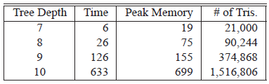 아래는 Tree의 깊이에 따른 연산시간(초)와 메모리 사용량(Mb), triangle mesh갯수입니다.