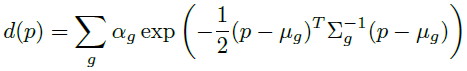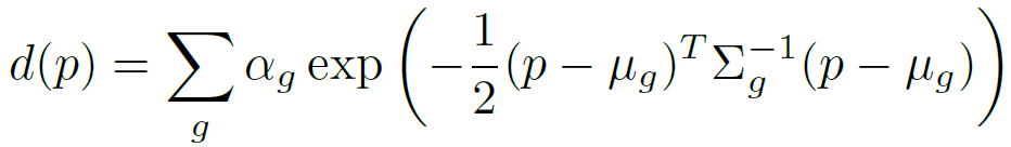본 논문에서 제시하고 있는 가우시안의 수식은 B와 같이 가장 짧은 반지름(S)의 방향을 기준으로, 멀어지면 밀도(d함수:density)가 낮아지는 형태입니다. 타원에서 멀리있는 점이더라도, 짧은 반지름 방향에 대해서는 떨어진 거리가 짧다면 밀도가 높게 됩니다.