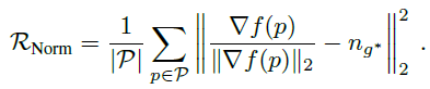 여기까지가 Regularization Term에 대한 설명이고, 별도로 SDF의 Normal값(수직인 벡터)로 만들어지는 Normal Regularization Term이 더 있습니다. (Norm이 보통 Normalization의 약자로 쓰이는데 여기에선 Normal의 약자로 보입니다.)