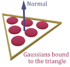 [해결방안3]에서 언급됬던 Refinement 단계에 해당하며 mesh에 color를 입히는 단계로도 볼 수 있습니다. Gaussian Splatting Rasterizer를 사용해서 Gaussian과 Mesh를 연결하고 이 둘을 같이 optimization하게 됩니다. 이전 단계에서 Mesh가 만들어지면, Mesh 위로 3D Gaussian들이 인스턴스화됩니다. (참고로 인스턴스화라는 용어는 프로그래밍에서 class를 메모리로 올려서 실체화 할 때 사용됩니다.) 이 과정 후 Gaussian은 더 이상 3D형태가 아니라 triangle위의 2D형태가 됩니다. n개의 얇은 3D Gaussian들을 아래와 같이 Mesh를 구성하는 각 triangle의 surface로 매칭시킵니다. 정확히 언급되지 않았지만 어떤 triangle를 포함하는 Gaussian들이 해당 triangle로 맵핑 되는 것으로 생각되어집니다.