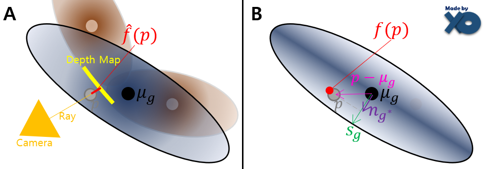 B형태로 설계할 경우, Surface를 표현하기 위해 타원이 납작해지게 됩니다. 하지만 렌더링은 A형태가 되어야 자연스럽게 Scene을 표현 할 수 있습니다. 때문에 Sampling한 point p 에 대해 A가 B의 특성을 갖도록 ' surface를 기준으로 떨어진 distance인 함수f'의 차이로 Loss가 설계되었습니다.