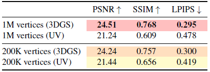 Mesh 적용 전 단계에선, base연구인 3DGS보다 낮은 성능을 가집니다.