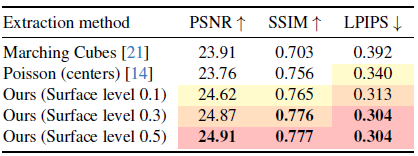 marching cube 알고리즘(이전글)을 적용했을 경우, Poisson Reconstruction시 sampling되는 point들을 Gaussian의 중점들로 사용했을 경우, Surface Density level을 0.1~0.5로 변경 하였을 경우를 나타냈습니다. 0.5로 할 때 가장 좋은 성능을 보이는데 왜 0.3을 기본으로 했는지 모르겠네요.