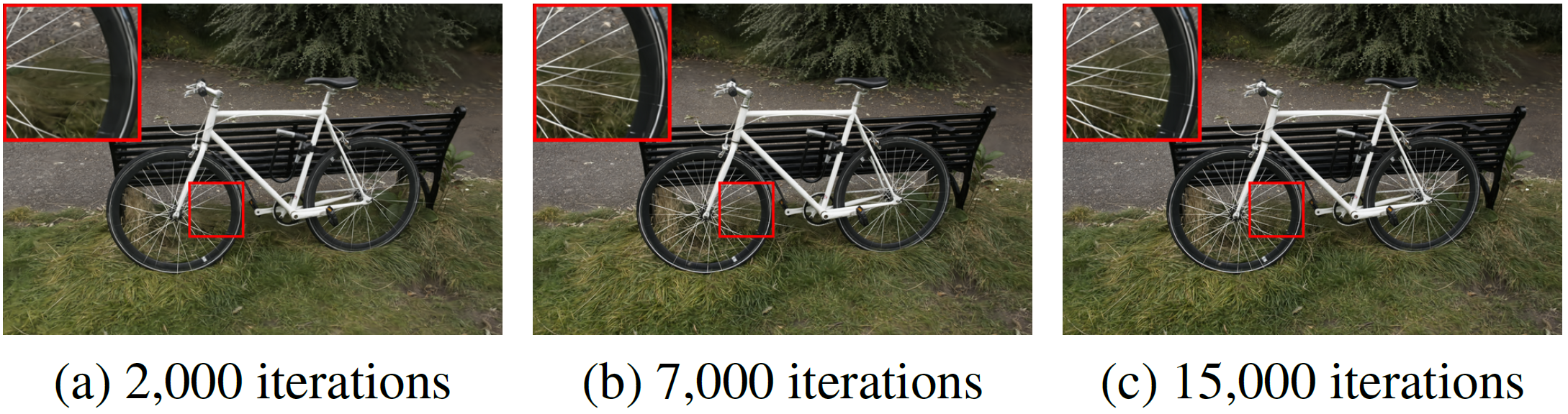 1~4단계를 모두 합치면 총 15,000 iteration으로 학습됩니다. 특정 point의 density 계산시, point에서 가까운 16개의 gaussian의 density값을 사용하였고 500 iteration마다 가까운 gaussian의 list를 업데이트하였습니다.