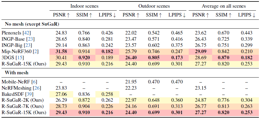 Mesh 적용 전 단계에선, base연구인 3DGS보다 낮은 성능을 가집니다.