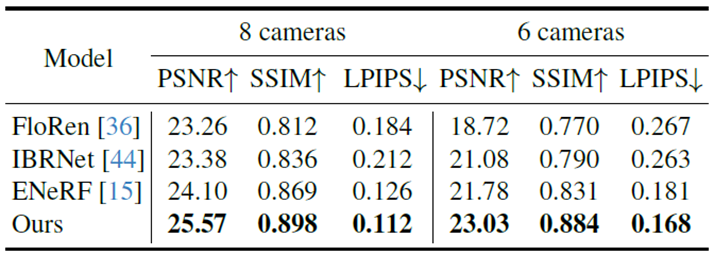 카메라를 8개가 아닌 6개로 바꾸었을 경우 실험결과 입니다. 퀄리티가 약간씩은 떨어지지만, 여전히 다른 연구들대비 높은 퀄리티를 보이는 것을 볼 수 있습니다.