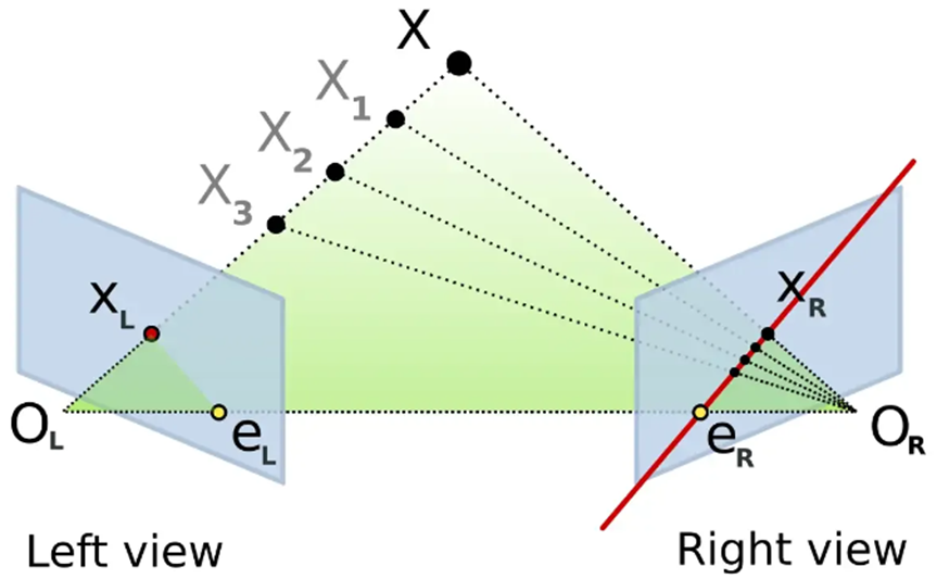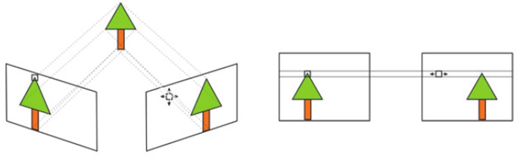 (2장의 이미지가 주어졌을 때 pixel당 변화량을 추정하는) optical-flow estimation 알고리즘의 용도를 바꾸어 depth estimation을 수행하고 있습니다. 이게 가능한 이유는 여기에선 2개 카메라간의 상대적인 rotation정보, translation정보가 주어지기 때문입니다. 추가적으로 수직방향의 변화량도 없도록 상황을 제약해두었습니다. (그림 출처 : link)