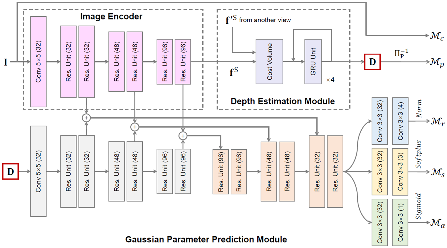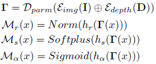 위 Network 이미지를 보면, Gaussian Parameter Prediction Module의 입력은 D(=depth map)으로 쓰이고, RGB를 encoding할 때 중간 layer의 feature를 UNet의 입력으로 사용하는 것을 볼 수 있습니다. 결과적으로 RGB와 Depth의 feature정보를 사용해서 backbone을 구성하게 됩니다.