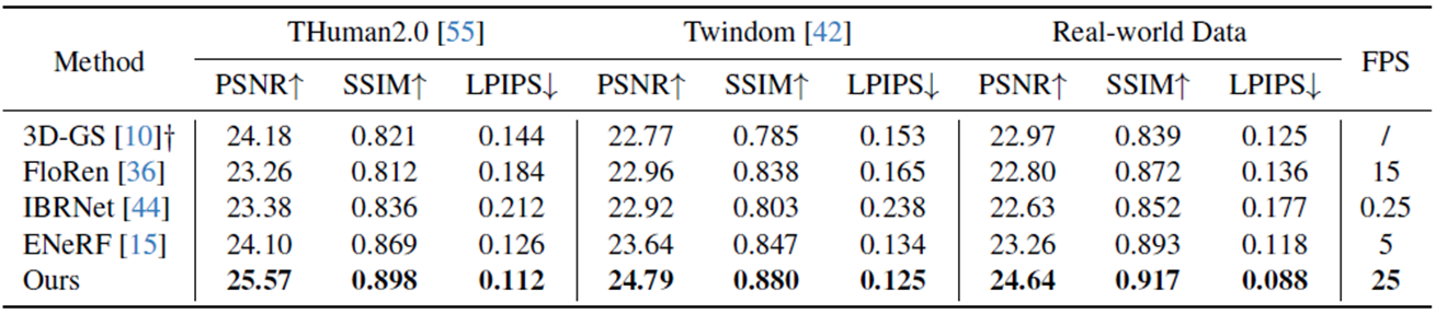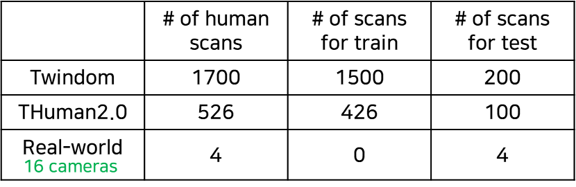 실험 데이터는 아래와 같이 구성됩니다. Twindom, THuman2.0은 8개의 카메라로 구성되고, real-world는 저자가 촬영한 이미지로써 16개의 카메라로 구성됩니다.
