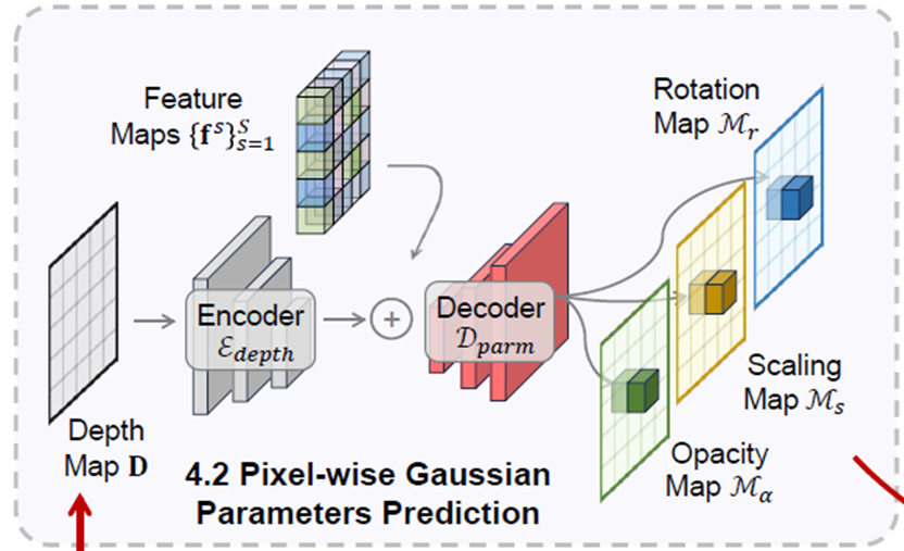 - depth feature와 color feature를 MLP에 넣어 해당 3D Gaussian의 rotation, scale, opacity를 결정합니다.