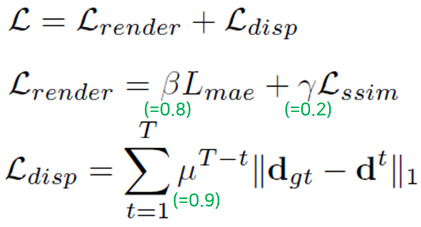 render loss는 L1 loss(=mae)와 SSIM loss로 구성되어 있습니다. disparity loss는 depth에 대한 정답값이 따로 주어지는 것으로 보여집니다. 초록색으로 표시한 부분은 실험부분에 있는 수치를 참조해서 제가 따로 적어넣은 부분입니다.