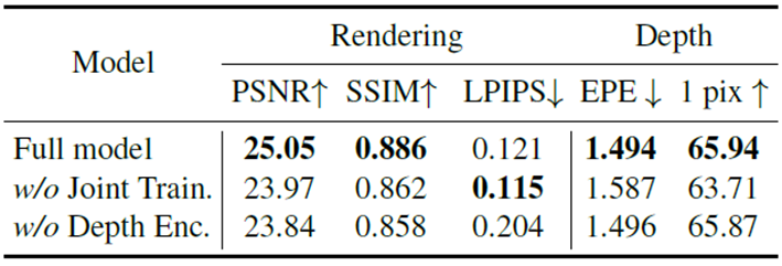 Joint Training을 제거하였을 경우, depth encoding feature를 사용하지 않았을 경우 성능입니다. Joint Training을 하지 않았을 경우 성능 하락이 큰 것을 볼 수 있습니다. 가장 오른쪽 열을 보면 depth값에 대한 성능평가도 같이 한 것을 볼 수 있습니다.