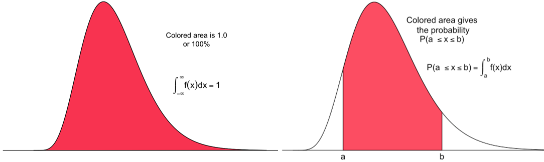 연속 사건의 확률 분포를 표현하는 함수 중에 하나로써, 확률 밀도 함수(=PDF=Probability Density Distribution)를 사용합니다. 사건(x)에 대한 확률값(y)으로 구성되어 있으며, y는 항상 0이상이고 전체 면적(=적분값)이 1인 함수 입니다. (그림 출처 : link)