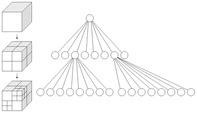 Octree란? 여덟개(oct)의 자식 노드를 가진 트리 자료구조로, 삼차원 공간을 재귀적으로 분할할때 사용합니다.