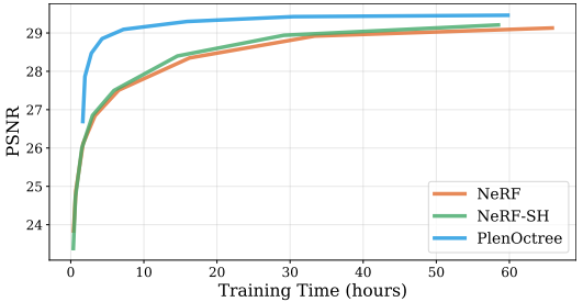 - Training 시간을 비교하였을 때, NeRF와 NeRF-SH는 비슷한 성능을 보였고, NeRF-SH가 수렴되기 전에 ealry stop한 뒤 PlenOctree로 conversion하여 학습하였을 때, 빠르고 좋은 퀄리티를 보여줬습니다. (아래 그래프를 보면, PlenOctree 시작 시간이 약 1시간 뒤인 것을 볼 수 있습니다.)